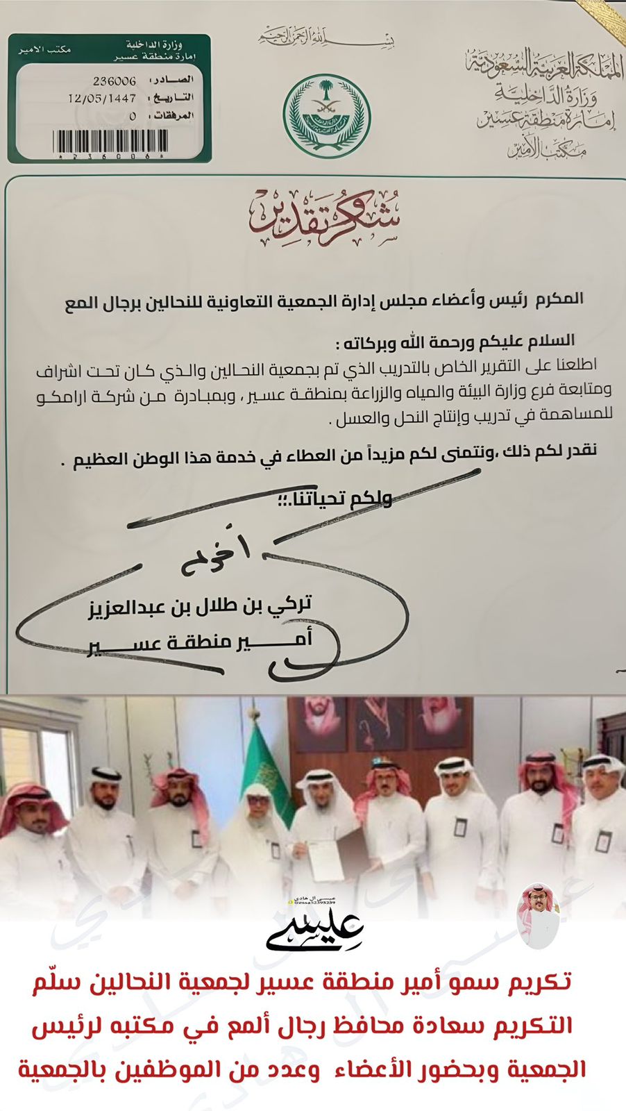 تشرفت جمعية النحالين التعاونية برجال ألمع بخطاب شكر من صاحب السمو الملكي الأمير/ تركي بن طلال بن عبدالعزيز آل سعود، امير منطقة عسير،الداعم الاول لكل المبادرات والانشطه التي تسهم في تنميةالمنطقة والمجتمع تقديرًا لجهودها في تنمية قطاع النحل والعسل.